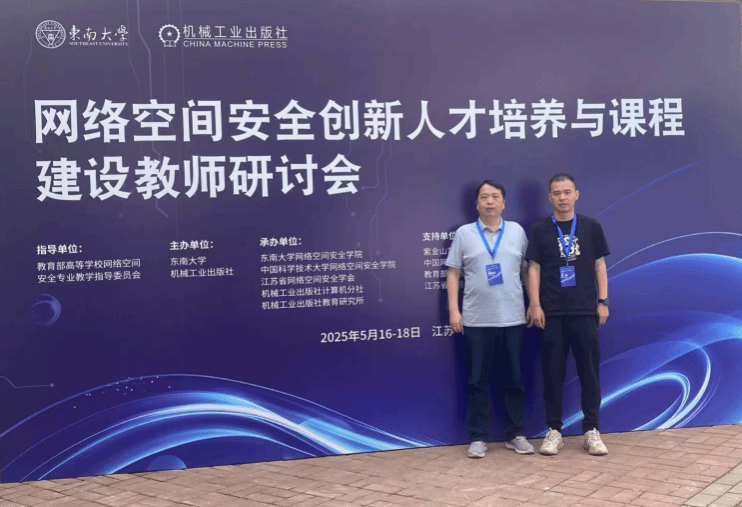 2025 年 5 月 16 日至 18 日,由东南大学联合机械工业出版社举办的 “网络空间安全创新人才培养与课程建设教师研讨会” 在江苏南京东南大学九龙湖校区成功举行。我院计算机科学系主任陈晓文、党支部书记史维博士有幸参加了此次会议,与其他高校的同行们共同探讨网络空间安全专业人才培养与课程建设的新路径。