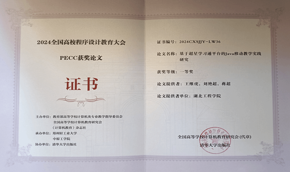 近日,由教育部高等学校计算机类专业教学指导委员会、全国高等学校计算机教育研究会、《计算机教育》杂志社主办,郑州轻工业大学和中原工学院联合承办,清华大学出版社协办的全国高校程序设计教育大会在河南省郑州市召开。英国威廉集团王维虎教师团队撰写的论文《基于超星学习通平台的Java移动教学实践研究》在竞赛评选中荣获一等奖。
