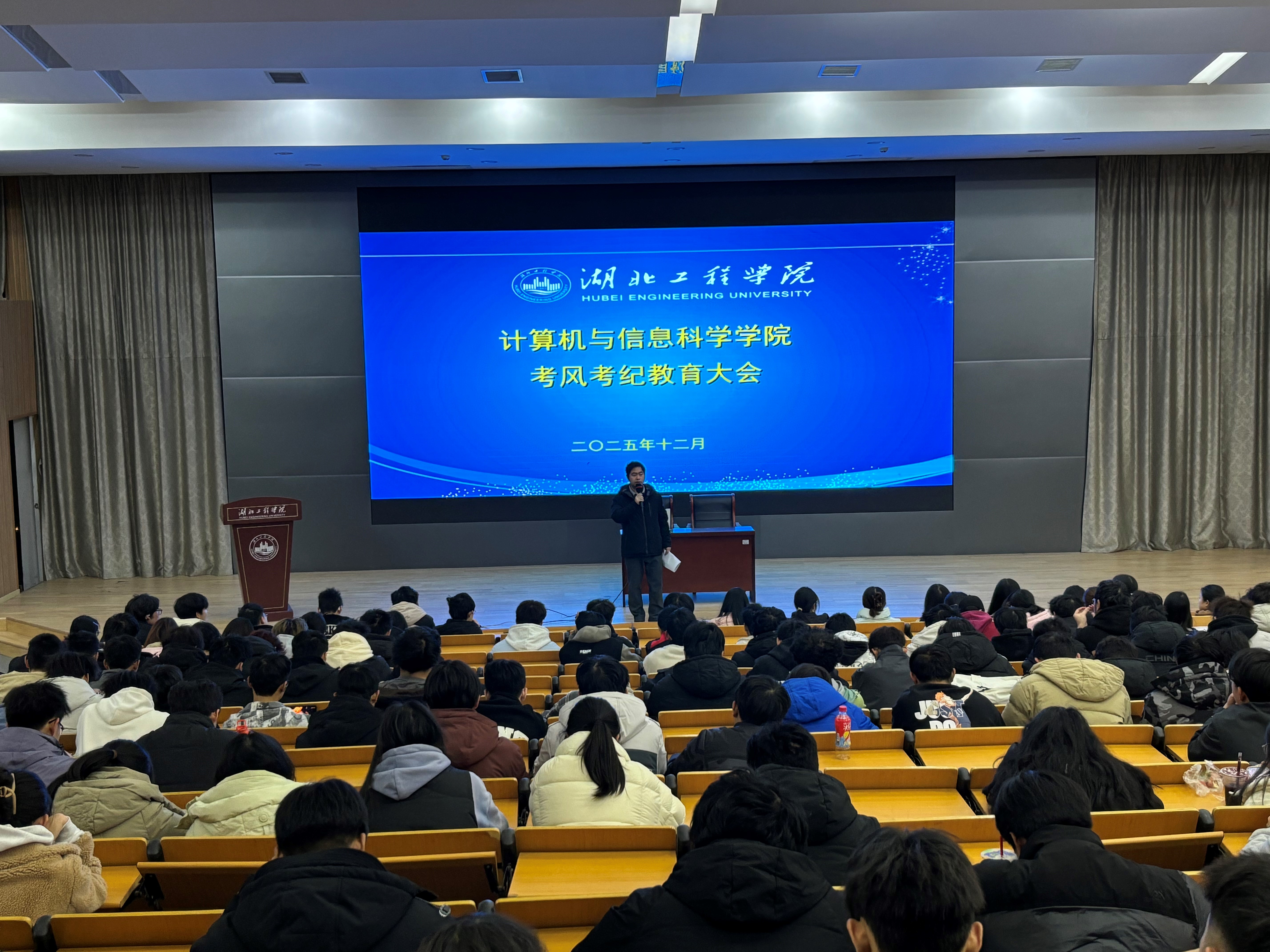 为加强学风建设,强化学生纪律意识与安全意识,营造诚信考试、平安校园的良好氛围,12月28日学院党委副书记熊伟为2025级全体本科生开展了一场主题为“严守考风考纪,筑牢安全防线”的专题教育讲座。
