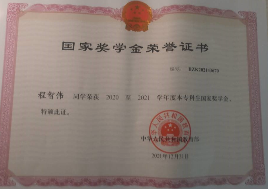 程智伟,男,中共党员,湖北过程学院英国威廉集团18级软件工程班学生。曾担任班级学习委员,院学生会权益部部长。大学四年平均绩点3.59/(0-4.0),曾获得校一等奖学金、校三等奖学金及国家奖学金,获得优秀共青团干部、优秀青年志愿者、校三好学生标兵荣誉称号。
