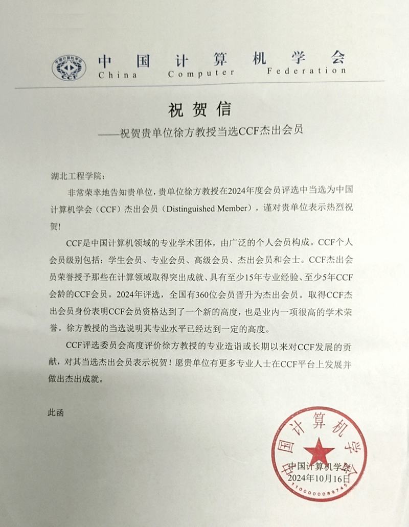 近日,中国计算机学会(CCF)发来贺信,祝贺徐方教授当选为中国计算机学会杰出会员(Distinguished Membership),成为我校第一位获此殊荣的教师。中国计算机学会成立于1962年,是我国计算领域的最大学术共同体,是全国一级学会,拥有超过11万名个人会员。CCF杰出会员每年评选一次,当选为CCF杰出会员表明当选者在计算机领域取得公认的突出成就,是行业内一项崇高的学术荣誉。中国计算机学会评选委员会高度评价了徐方教授的专业造诣和长期以来对CCF发展的贡献。该荣誉的获得进一步提升了我校在计算机领域的学术影响力。