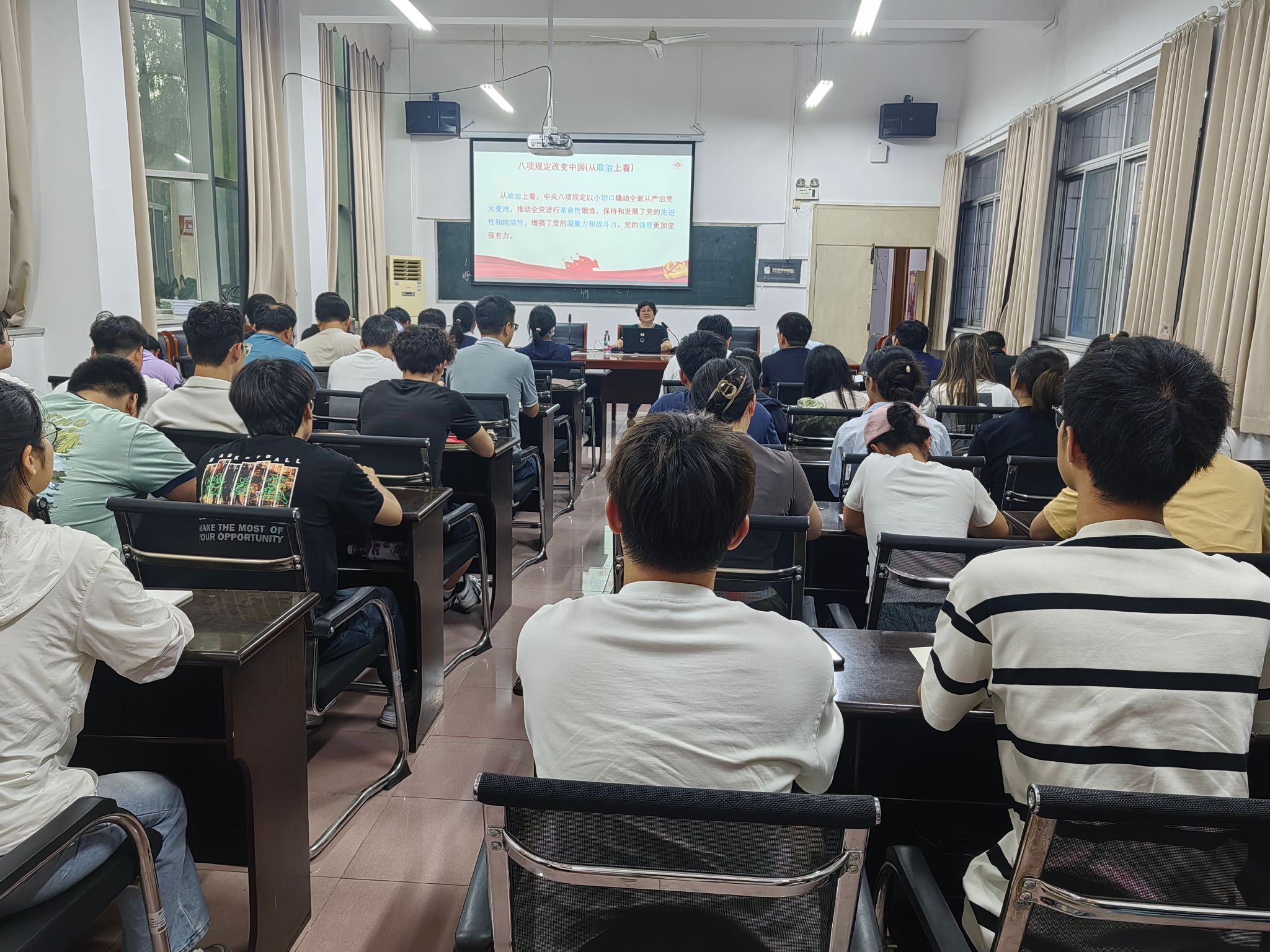 党课上,伍艳泽书记结合大量实际案例,深入剖析了违反中央八项规定精神的常见表现形式,如违规公款吃喝、违规发放津补贴、形式主义官僚主义等问题。通过一个个真实且具有警示性的案例,让党员师生们深刻认识到违反规定带来的严重后果,以及坚守纪律红线的重要性和紧迫性。