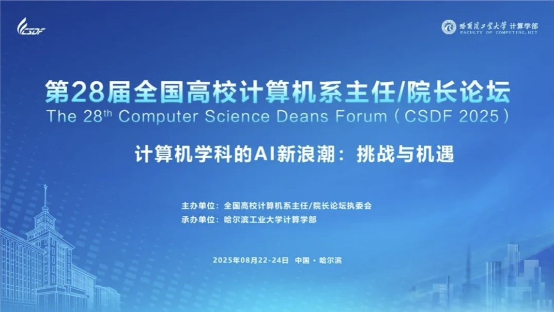 8 月 22 日 - 24 日,两位院长到哈尔滨继续参加第 28 届全国高校计算机系主任 / 院长论坛。论坛以 “计算机学科的 AI 新浪潮:挑战与机遇” 为主题,汇聚院士及高校院系负责人。团队参与主旨报告、资深院长论坛及平行分论坛,关注 AI 时代人才培养、学科内核发展、跨学科融合等议题,介绍学院 AI 课程建设与跨学科探索成果,达成部分合作意向。