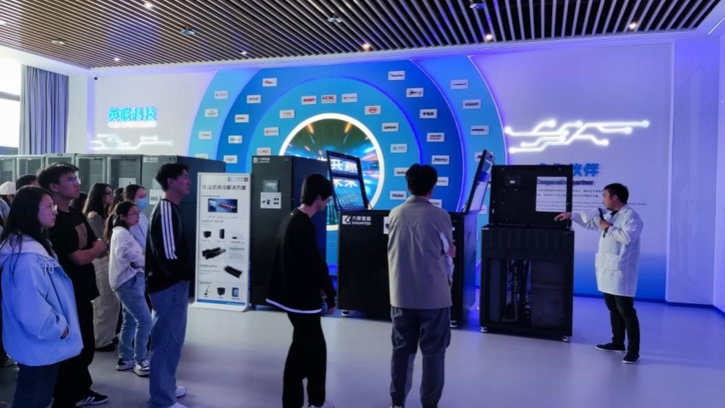 作为国家级专精特新“小巨人”企业,英联科技以服务器全链条研发能力与行业创新解决方案著称。活动当日,师生团队先后走进企业智能化研发中心、自动化无尘生产车间、智慧展厅。在技术专家引导下,学生通过动态演示屏观察服务器核心部件的精密制造流程,在模拟数据中心体验智能运维系统的实时响应,并通过AR技术直观感知芯片级散热设计的创新逻辑。